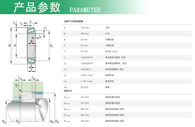 FAG圆锥滚子轴承 产品特征 1、改善了内外圈和滚子的表面质量 2、优化了内圈的挡边和滚道几何 3、优化了滚动体几何 4、品质的内外圈材料 5、改进了热处理 6、标准化了保持架的设计 FAG圆锥滚子轴承32238A 1、外圈可分离型; 2、滚子与滚道接触设计是滚动体实现纯滚动,减少摩擦和磨损; 3、可承受大的径向载荷和单向轴向载荷,但是为了可承受双向轴向载荷,需要两个一起来配对安装; 4、后缀A表示内部结构变更;X表示外形尺寸采用国际标准;B表示加大的接触角; 应用设备部位:重齿减速机VBP1800高速轴