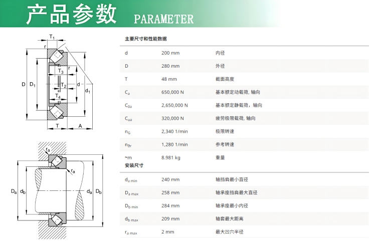 FAG调心滚子轴承 产品特征 1、优化了内部结构以提高载荷承载力 2、新滚动体尺寸,端部为弧形 3、改善了表面质量 4、优化了滚动体和滚道之间的接触几何 5、提高了运行精度 6、浮动的中心挡边 7、新设计的钢保持架和铜保持架