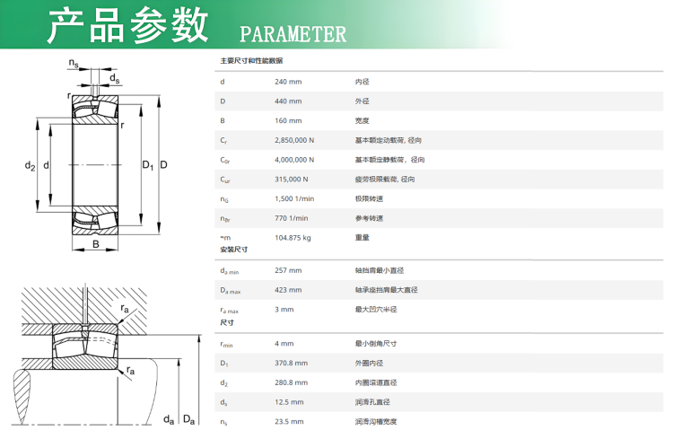 FAG调心滚子轴承 产品特征 1、优化了内部结构以提高载荷承载力 2、新滚动体尺寸,端部为弧形 3、改善了表面质量 4、优化了滚动体和滚道之间的接触几何 5、提高了运行精度 6、浮动的中心挡边 7、新设计的钢保持架和铜保持架