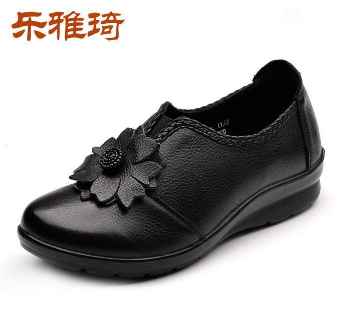 真皮花朵舒适单鞋中老年妈妈鞋坡跟女鞋